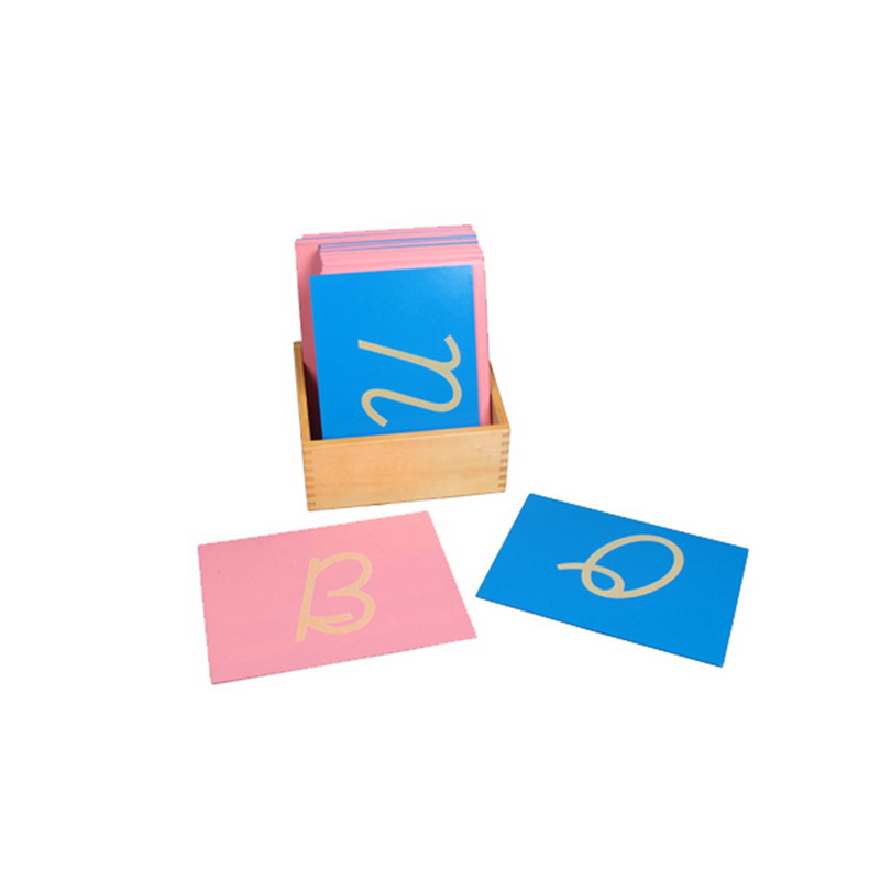 The sandpaper letters allow children to understand writing before they can hold a pencil. Children use three of the five senses: tactile, auditory, and sight to learn the sound and formation of each letter. 26 cursive uppercase letters with consonants on pink boards and vowels on blue boards.