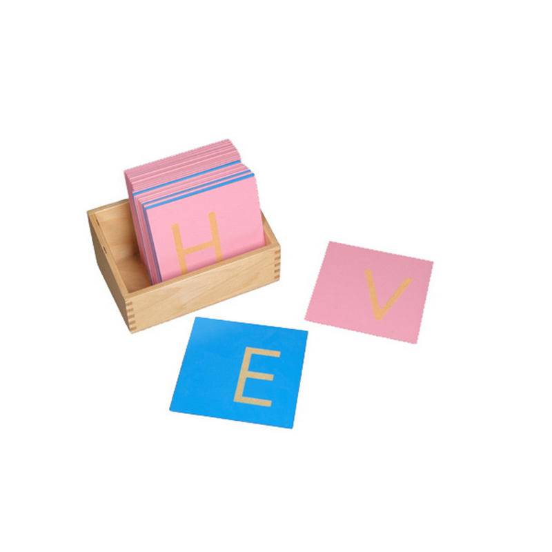 The set includes 26 print sandpaper letters in uppercase. Consonants are mounted on pink wooden boards and vowels on blue boards for easy identification. Includes an extra "y" on blue board for vowel teaching.