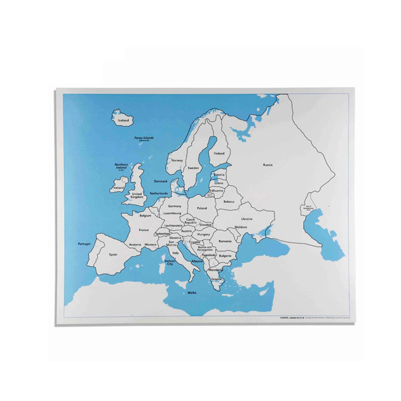 The Control Maps-Labeled are used first to help children identify each continent, country, or state by reading its name. This labeled map is specifically designed to be used with the Puzzle Map of Europe, providing a reference for geography learning.