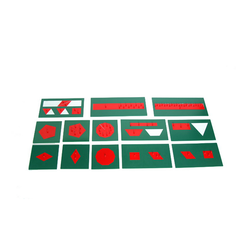 Metal Inscribed & Concentric Figures include twelve metal insets with green metal frames showing all kinds of figures. Following Maria Montessori's principle: "I listen it, but I will forget it later; I see it, I will remember it; I do it, I understand it." These materials allow children to choose their interest material and operate by themselves, developing mathematical knowledge through analysis and integration, helping them understand logical quantity concepts and expand their spatial understanding.