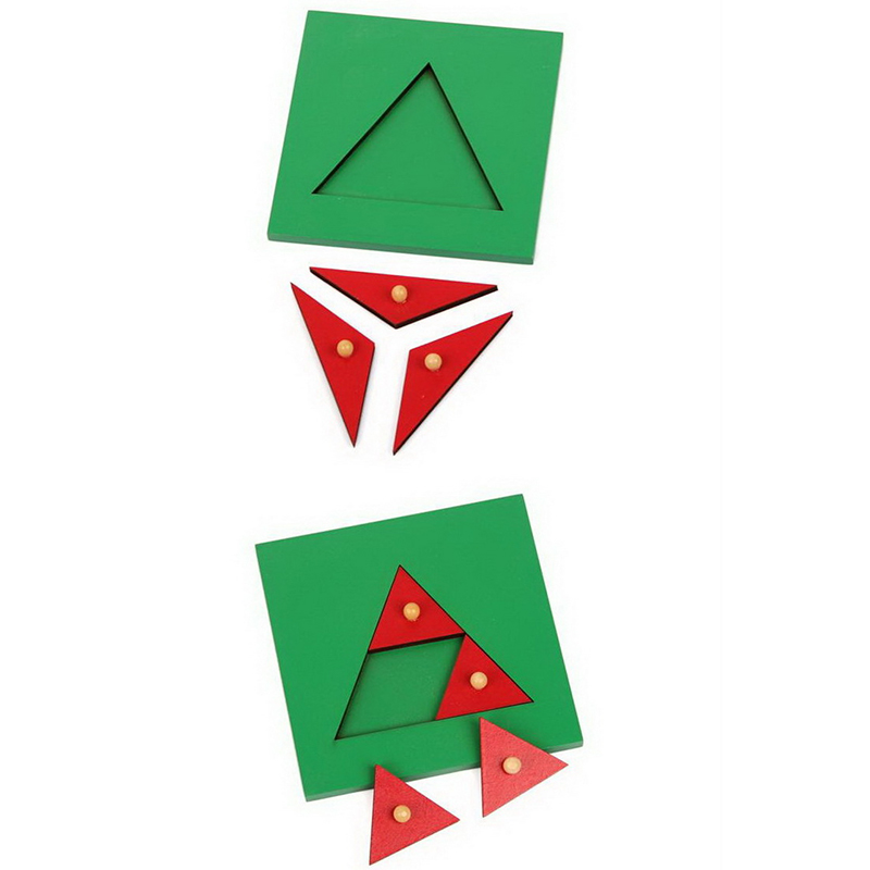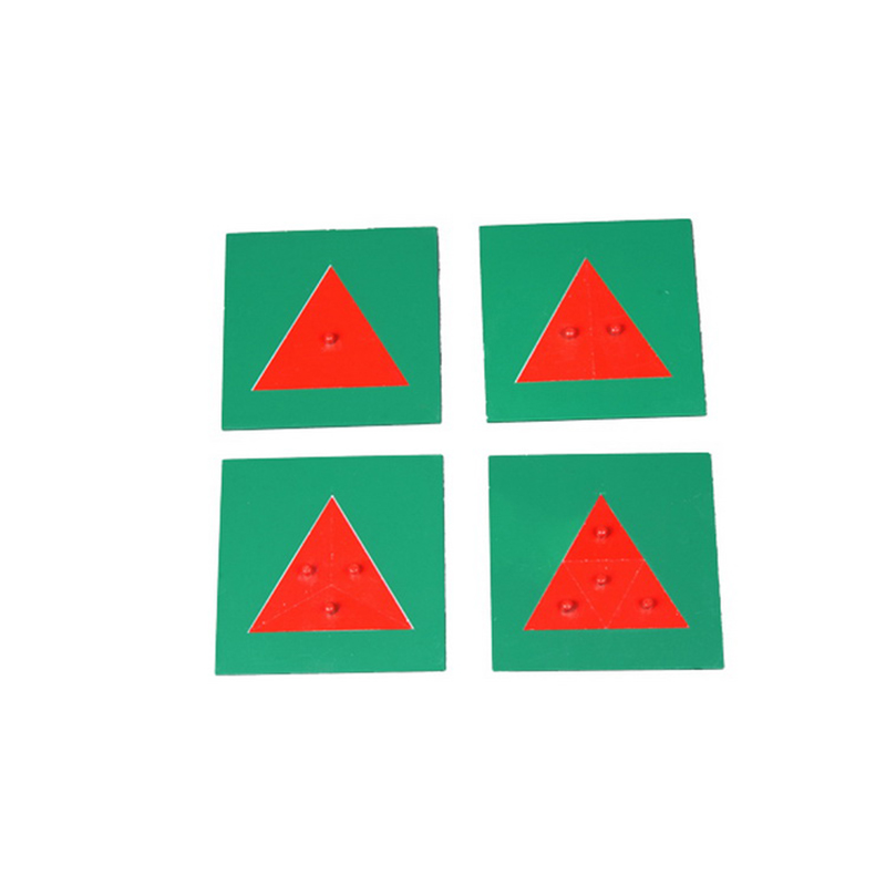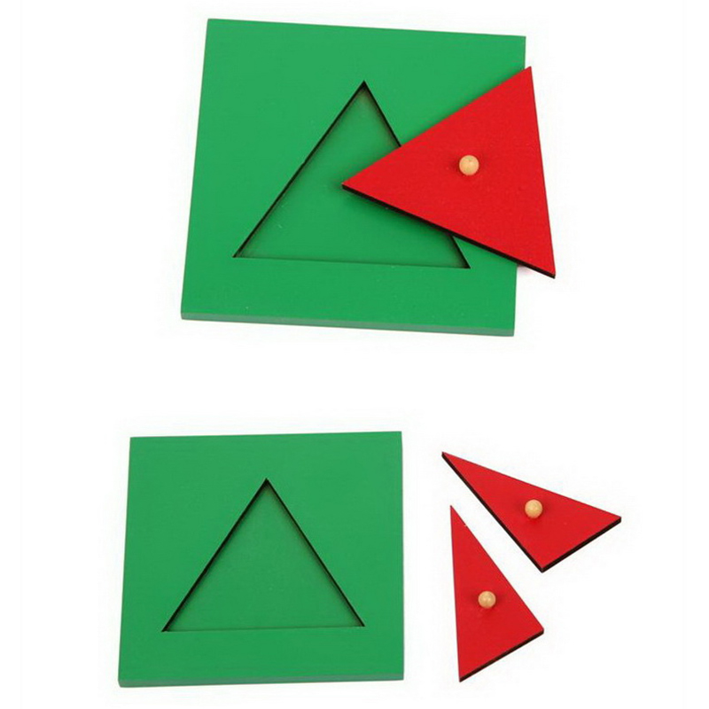 The Metal Triangles introduce children to all aspects of fraction work, including equivalency, arithmetic functions, conversion to decimals, and measurement of angles. Features 4 red metal insets with green frames showing triangles progressively divided into smaller sections from 1, 1/2, 1/3, 1/4.