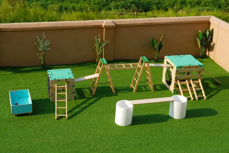 - Features: Climbing nets, perforated boards, modular framework.
