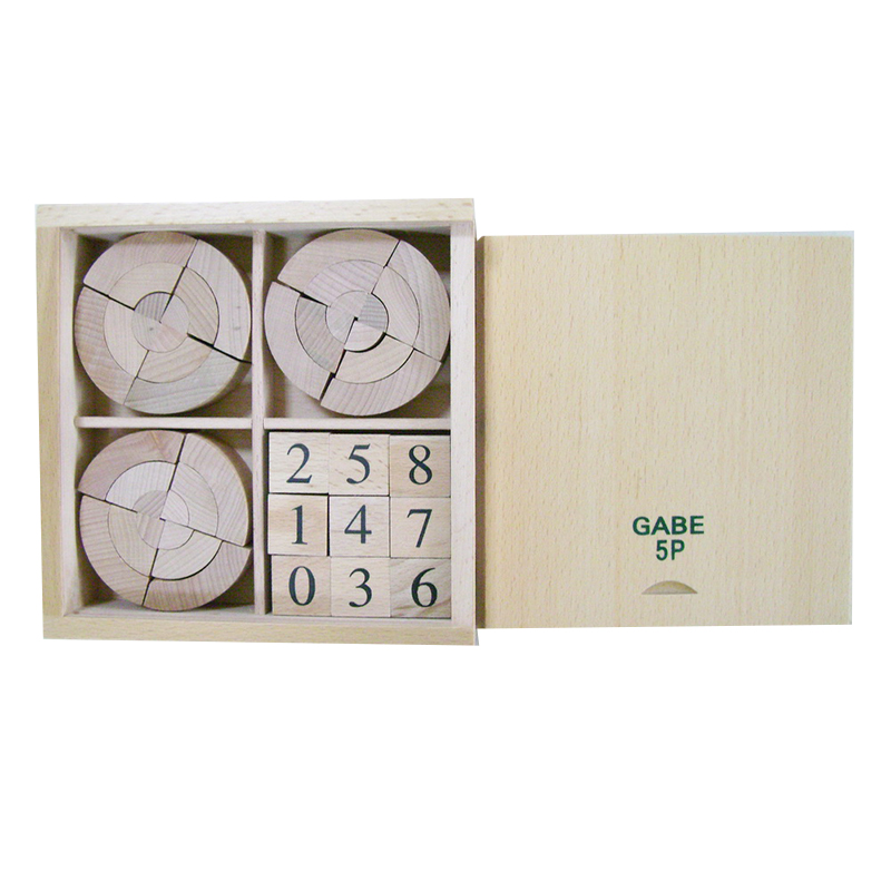 Components: 3 cylinders with concentric rings + 9 numbered cubes