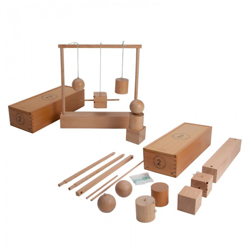 The set includes two 2-inch cubes, one 2-inch cylinder, and one 2-inch sphere, all contained in a beechwood storage box. This is Froebel's second gift in the original kindergarten curriculum.