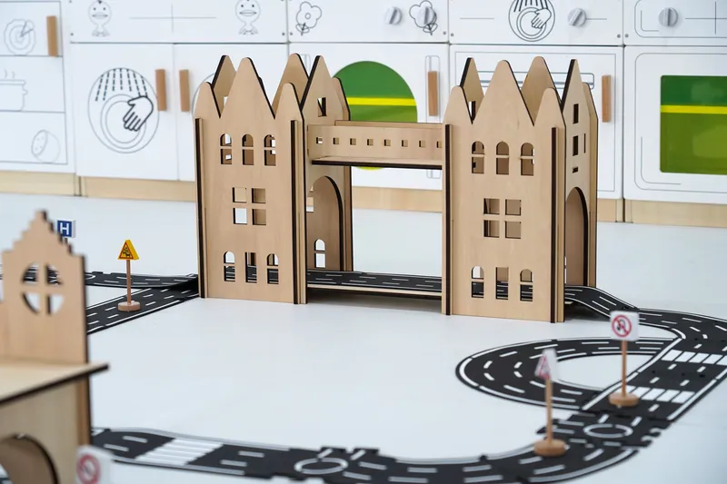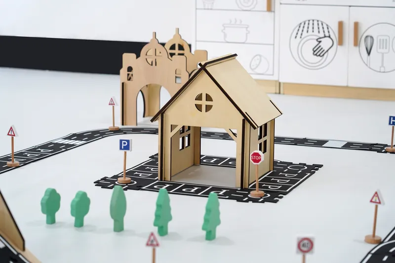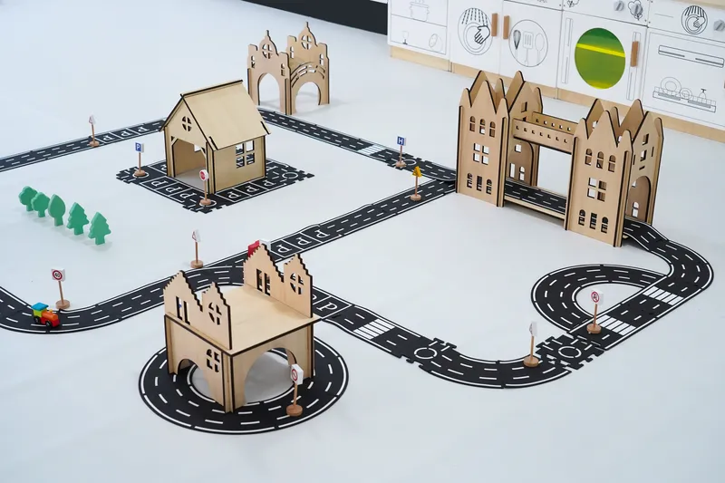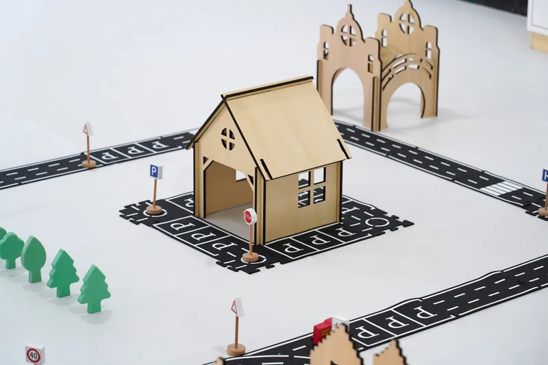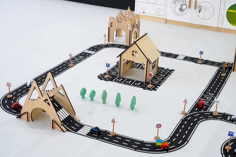 Made from PVC soft rubber road elements combined with plywood and beech wood structures. Features smooth finishing with burr-free edges and detailed traffic markings. All materials meet GB6675-2014 comprehensive testing standards.