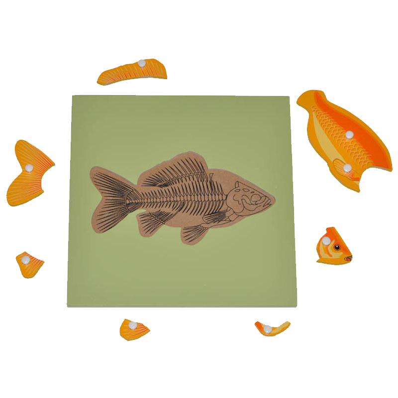 Following Montessori principles of 'I do it, I understand it', this puzzle allows children to explore and identify different parts of a fish skeleton through hands-on manipulation, promoting self-discovery and biological understanding.