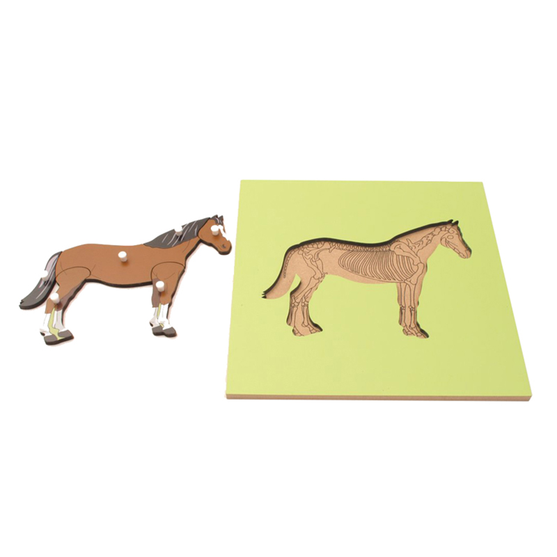 The Horse Skeleton Puzzle is designed for children aged 3+ years. It's perfect for developing biological knowledge, fine motor skills, and understanding of animal anatomy through hands-on Montessori learning.