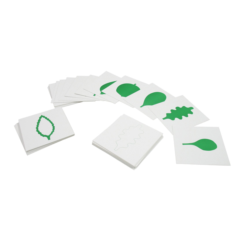 The Leaf Cards complement the Botany Cabinet by providing three series of 18 cards corresponding to the cabinet's leaf shapes. Each shape is represented by thin outline, thick outline, and filled-in cards, helping children understand that shapes remain the same even when presented differently.