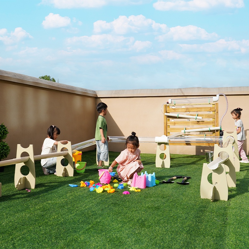 The system includes water wheels, sand manipulation areas, flowing channels, sensory exploration zones, balance elements, conveyor mechanisms, and multiple interactive play stations from our complete Sand & Water Play Series.